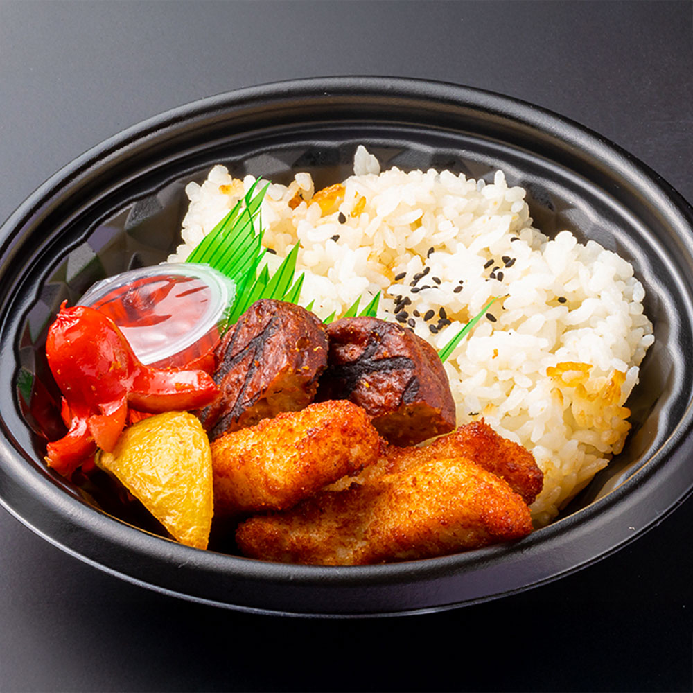 むねスティック3本+ミニハンバーグ+ウィンナー+ポテト+ゼリー+だしご飯